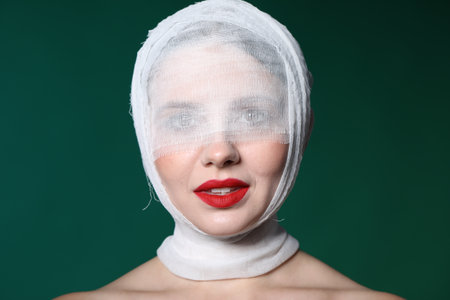 Woman with face wrapped in medical bandage after plastic surgery operation on green background