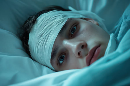 A bandaged man rests in a hospital bed with a solemn expression, surrounded by clinical lighting and medical gear.