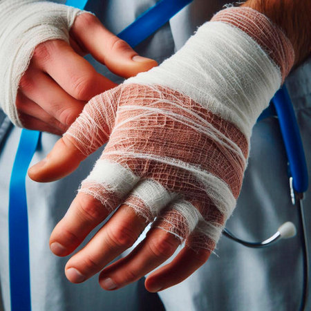 bearded man bandaged hand injury to fingers hospitalization hospital medicine