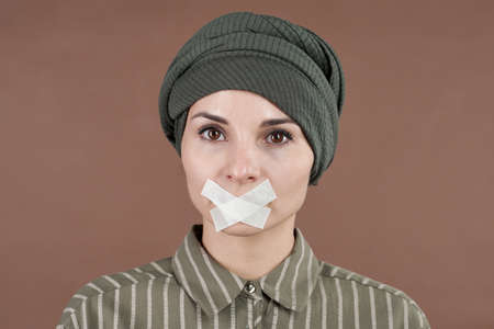 Contemporary young Muslim female with tape on her mouth looking at you while standing in front of camera in isolation