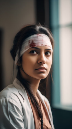 Close-up portrait of a beautiful young woman with a bandage on her head.