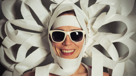 A woman with a large amount of toilet paper wrapped around her head, AI