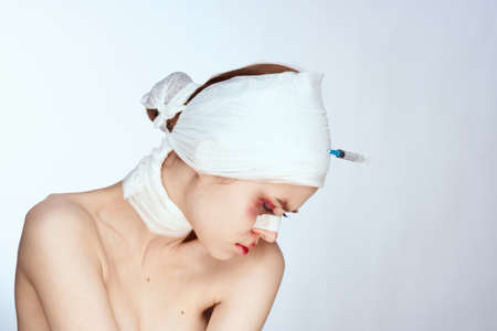 emotional woman plastic surgery operation bare shoulders light background