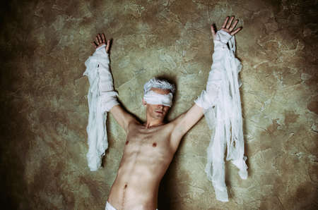 Studio image of a young man bandaged, on black background. Concept for health-care or ancient mummy