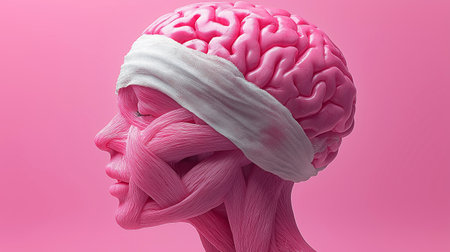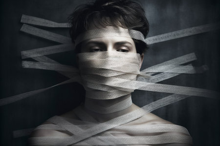 A hauntingly beautiful black and white portrait of a woman wrapped in white bandages, conveying emotions of vulnerability and isolation, perfect for themes of healing and protection