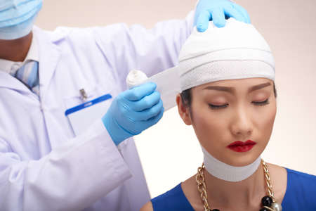 Plastic surgeon bandaging head of glamorous Chinese woman
