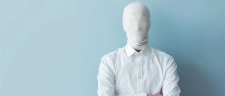 A person stands in front of a blue wall, wearing a white button-up shirt. Their face is completely covered with a white bandage. Their arms are crossed in front of them.