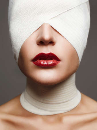glamorous image for halloween.female face wrapped in bandage.beautiful girls lips.beauty make-up woman.plastic surgery