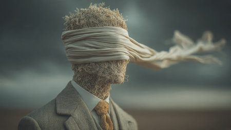 A person stands with a band of fabric over their eyes emphasizing themes of concealment and introspection in low light.