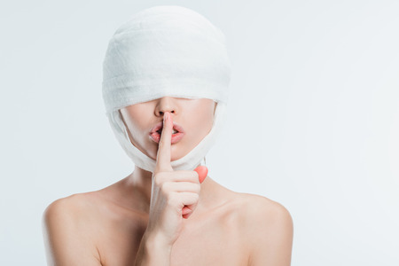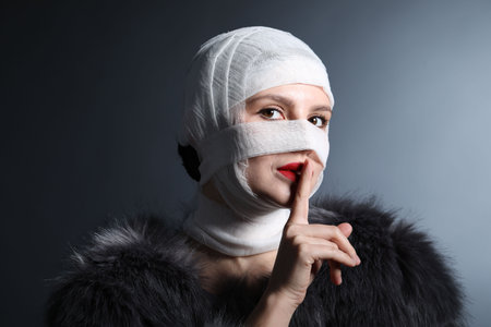 Woman with face wrapped in medical bandage after plastic surgery operation showing hush gesture on gray background