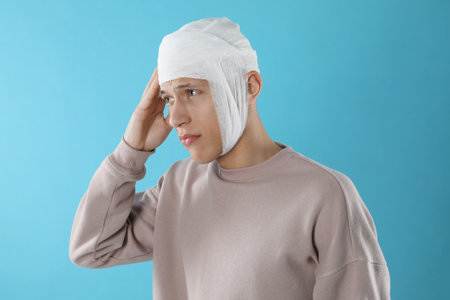 A battered man with a bandaged head and a cast on his arm stands on a gray background.