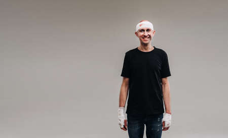 Against a gray background stands a battered and battered man in a black T-shirt with his head wrapped in a bandage.