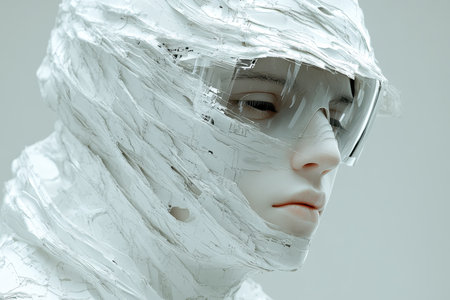 A sculptural representation of a figure enveloped in a thin, translucent layer. The subject wears clear protective glasses, showcasing a unique and modern aesthetic.