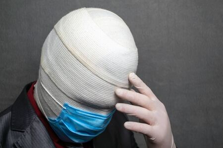 Injured young guy after surgery with bandage all over his face with one eye opened showing searching sign. Image related with treatment of the wounds, plastic surgery, medical industry