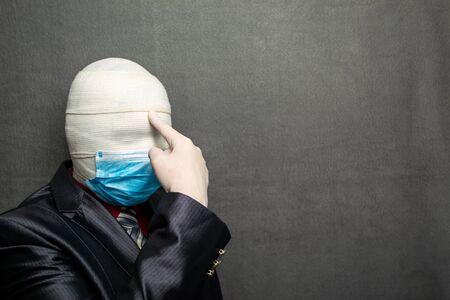 Business concept. Studio portrait of a businessman in a black suit and black shirt with a bandaged face looking directly into the camera. Black background.