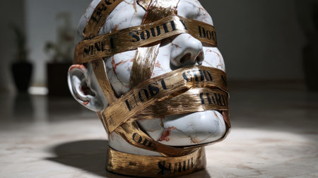 This striking art piece features a marble head sculpture elegantly wrapped in golden tape inscribed with powerful phrases, showcasing unique emotional expression.