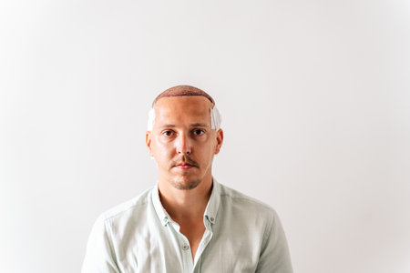 After hair transplantation surgical technique that moves hair follicles. Young bald man in bandage with hair loss problems. White background with copy space.