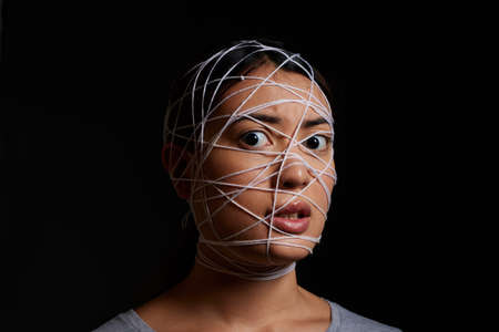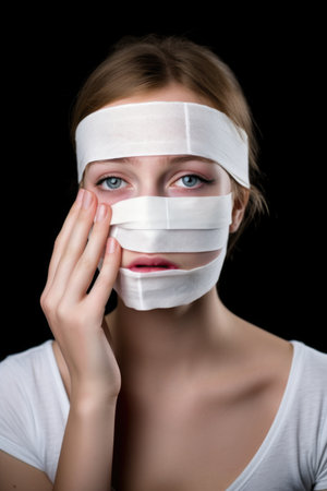 studio shot of a young woman with her mouth and eyes covered in bandages against a grey background