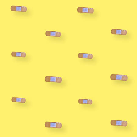 Colorful pattern of adhesive plasters on yellow background. Top view. Flat lay. Pop art design