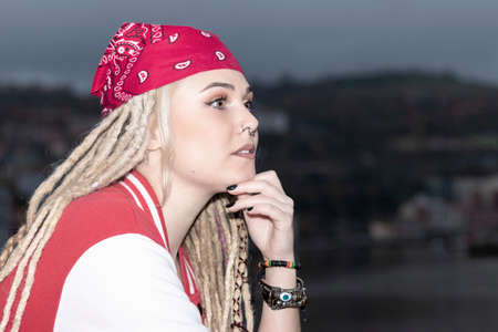 Beautiful european young blond woman in a red fashionable sweatshirt in a red stylish bandana with a hairstyle sitting outdoors on a sunny spring day. Pretty attractive girl enjoys the weekend.