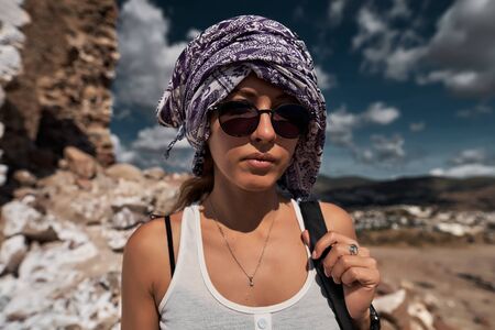 Portrait of a girl in a black headscarf in red polka dots. Beautiful European girl in a white suit in a normal urban setting. High quality photo