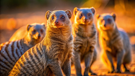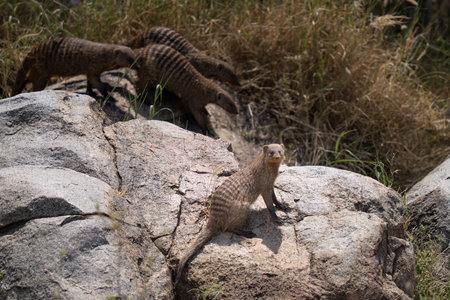 Group of common mongoose or ringed mongoose (Banded mongoose) in the grass