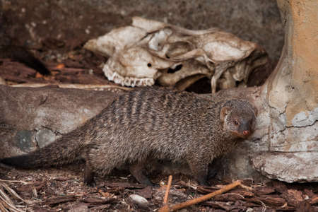 Mongoose and the skull (bones). Ferocious mongoose (pharaoh mouse) in its natural habitat. Close-up.