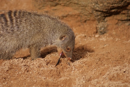 beautiful striped mongoose smelling the earth with rocks in the background in a zoo in valencia, spain