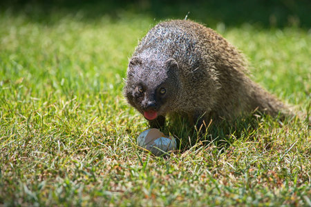 The banded mongoose (Mungos mungo) running on the green grass in the trees shade. South african small mammal, small predator.