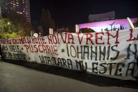 Bucharest, Romania November 4, 2015: For a second consecutive night, over 30.000 people gathered at the University Square in Bucharest and protest against the government and the corruption.