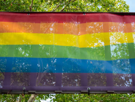 Blurred Gay Pride Rainbow Flag Against Trees, Selected Focus