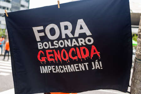 Salvador, Bahia, Brazil - October 02, 2021: Posters banners and shirts with words of Fora Bolsonaro at the protest held in the city of Salvador, capital of Bahia, Brazil.