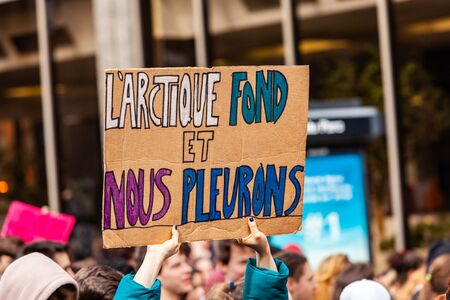 French sign held during ecological march. A cardboard sign reads the arctic melts and we cry in French as environmentalists march against climate change on an urban city street.
