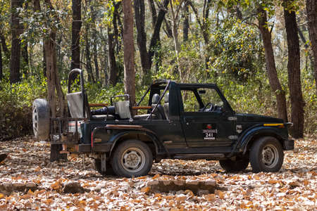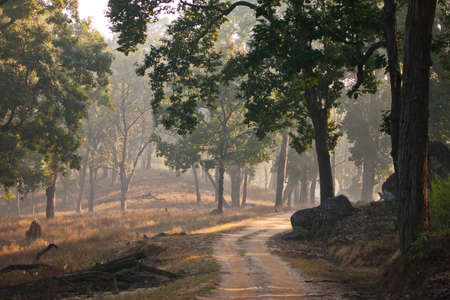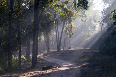 Beautiful sunny forest, beams of light obliquely and the road, Bandhavgarh. India.