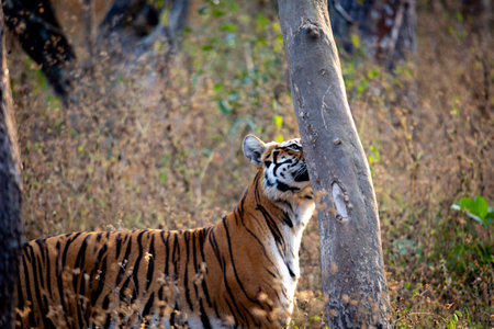 Royal bengal tiger in the nature habitat. Tiger pose during amazing light. Wildlife scene with danger animal. Hot summer in India. Dry area with beautiful indian tiger. Panthera tigris tigris.