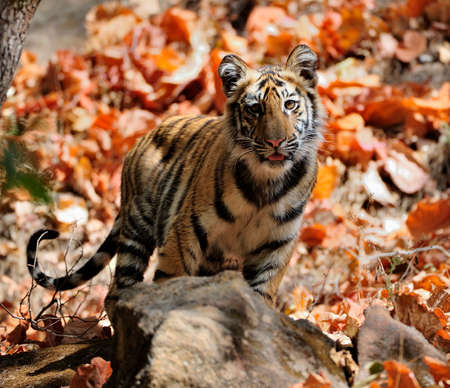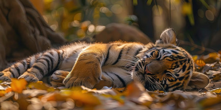 A young tiger cub makes its way through a serene autumn forest, bathed in warm sunlight. This captivating moment showcases the beauty of wildlife in its natural habitat.