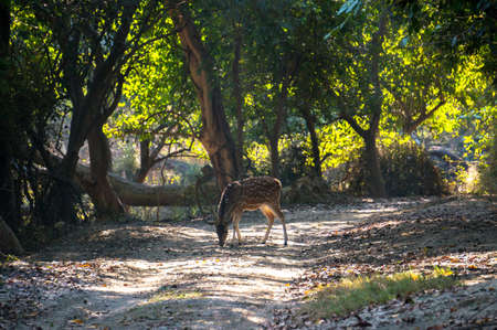 Lonely Sri Lankan Axis deer seen in the shade of the forest in Udawalawa national park safari.