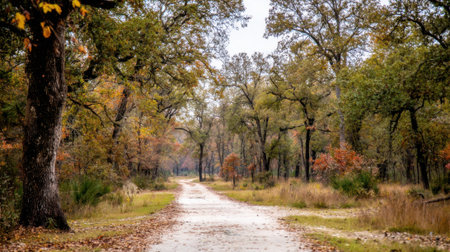 An empty gravel road disappears into a beautiful forest filled with trees showing their peak autumn foliage. The atmosphere is calm and peaceful.