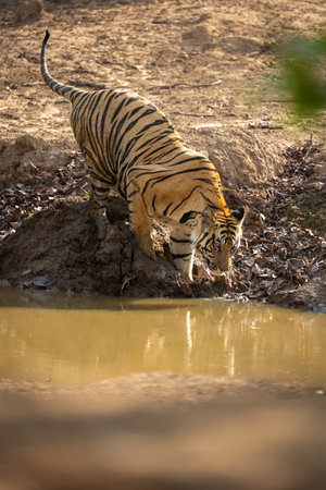Wildlife scene of dry deciduous forest of central india. After territory marking and morning stroll this Female bengal tiger quenching her thirst with blue lake water of rajbagh talao at ranthambore national park, rajasthan, india (panthera tigris)
