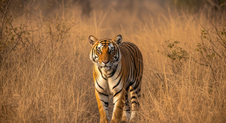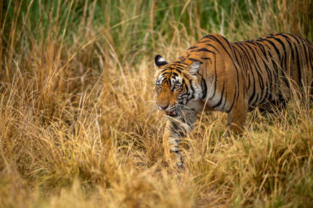 A Royal Bengal Tiger walking in the grassland bushes inside the Kanha National Park in Madhya Pradesh, India.