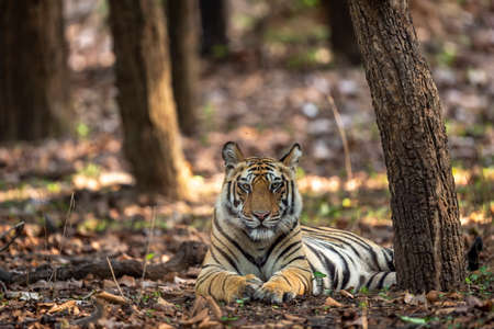 Tigress resting in nature habitat with green background at bandhavgarh national park or tiger reserve, madhya pradesh, india
