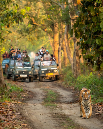 wild female tiger or panthera tigris a showstopper on morning stroll in her territory and blurred safari vehicles tourist in background at pilibhit national park forest reserve uttar pradesh india