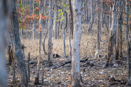 deep in woods Northern Plains Gray Langur or Hanuman langur or Semnopithecus entellus family sitting in summer season safari at panna national park tiger reserve madhya pradesh india