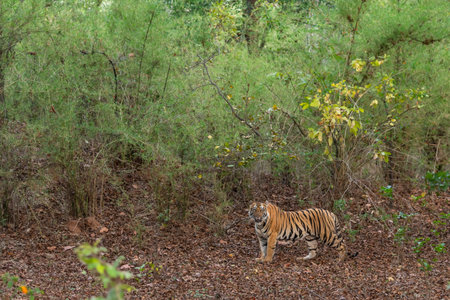 Indian tiger, wild danger animal in nature habitat, Ranthambore, India. Big cat, endangered mammal, nice fur coat. End of dry season, monsoon. Bengal tiger walking in old dry forest. Hidden in forest.