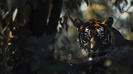 Tiger looking directly forward from behind green foliage, blending into the surrounding dense jungle environment, showing its powerful gaze and natural habitat