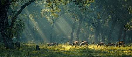 Two chital deers stand alert in a sunlit forest clearing. The golden light and calm environment highlight the beauty of these wild animals in their natural habitat.