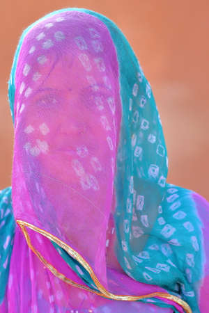 BUNDI, RAJASTHAN, INDIA - DECEMBER 09, 2017: Portrait of a beautiful woman with colorful dress and a pink veil covering her face in a village close to Bundi