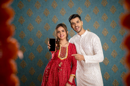 Group of indian friends in traditional Indian attire, holding and smiling at open red gift box filled with sweets