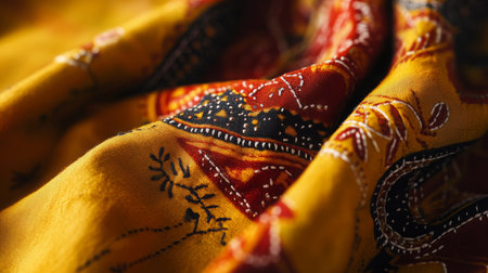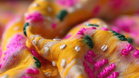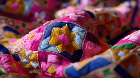 A vibrant close-up of traditional fabric showcasing intricate embroidery, beautiful patterns, and a colorful palette, perfect for artistic projects.