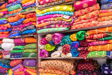 Beautiful colorful Indian sarees are displayed for sale at market place, Jaisalmer, India.